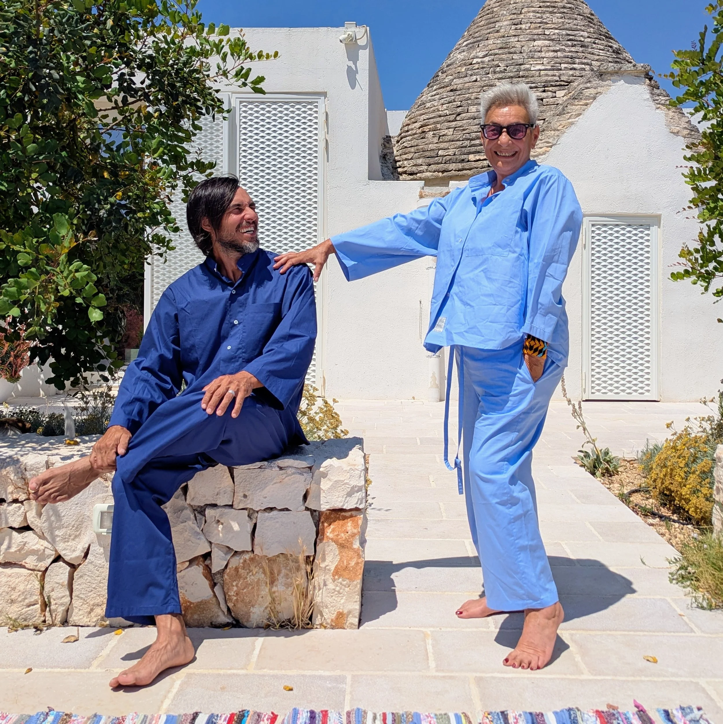 The pajamas pair a version of the nightshirt with a barrel style drawstring pant. Pockets, which are essential to all clothing, move from the shirt to the pants. Pajamas is a loose term for this outfit that can be worn all day, the shirt paired with jeans or more formal trousers and the pants with a T-shirt. Like our nightshirts, all seams are finished inside, all fabric is quality Italian deadstock cotton, linen wool or cashmere.