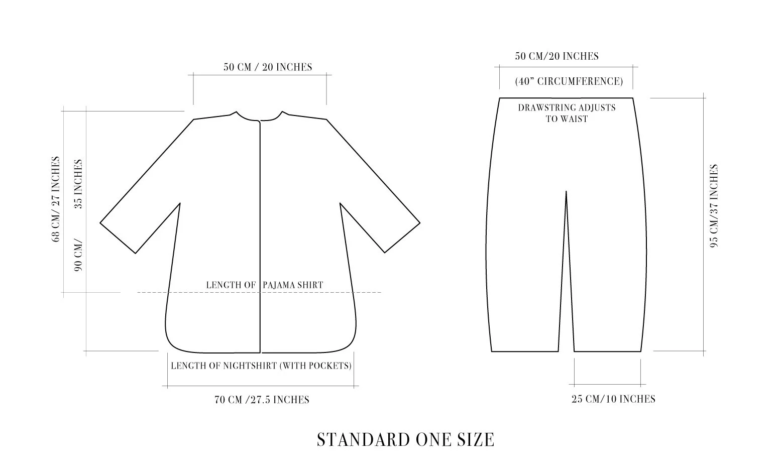 Our first edition was based on a one-size concept, because the deadstock fabric I was buying was only enough to produce one garment per piece of fabric not 3 or 4 for various sizes. However, the one size concept works for many, but not everybody. I started receiving requests for nightshirts that were slightly wider, or longer so I began to make bespoke versions. If you would like a shirt or pants in a slightly different size, contact me and we can talk about what kind of fabric interests you.